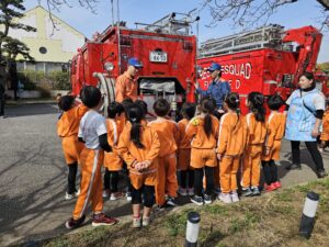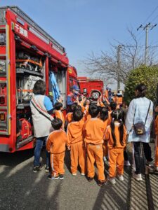 避難訓練や消火器取り扱いなどの訓練を行った後、待ちに待った消防車やレスキュー車の見学や写真撮影を行い、子ども達は大興奮!!